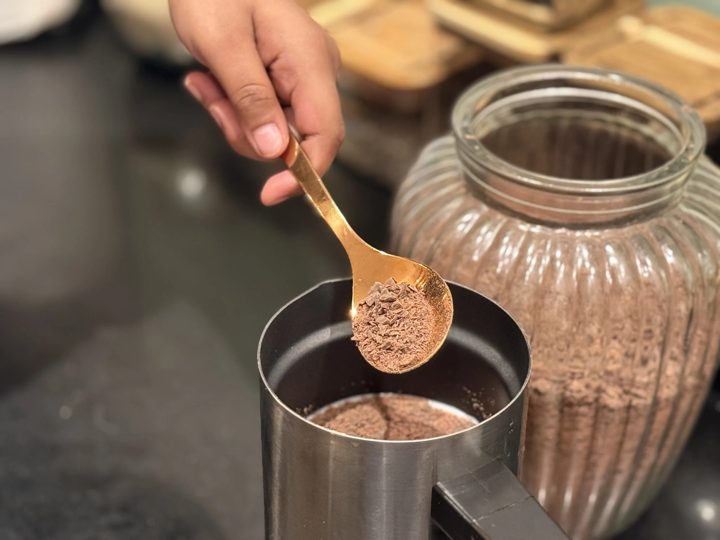 Cacao brokjes zijn gemakkelijk in gebruikt.